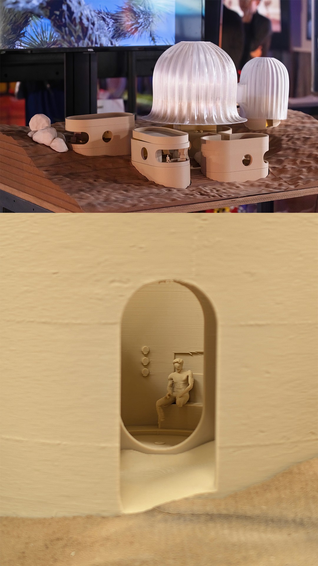 3D Printed Adobe: Local sand/silt/clay printed via Vulcan system for thermal-resistant, load-bearing walls