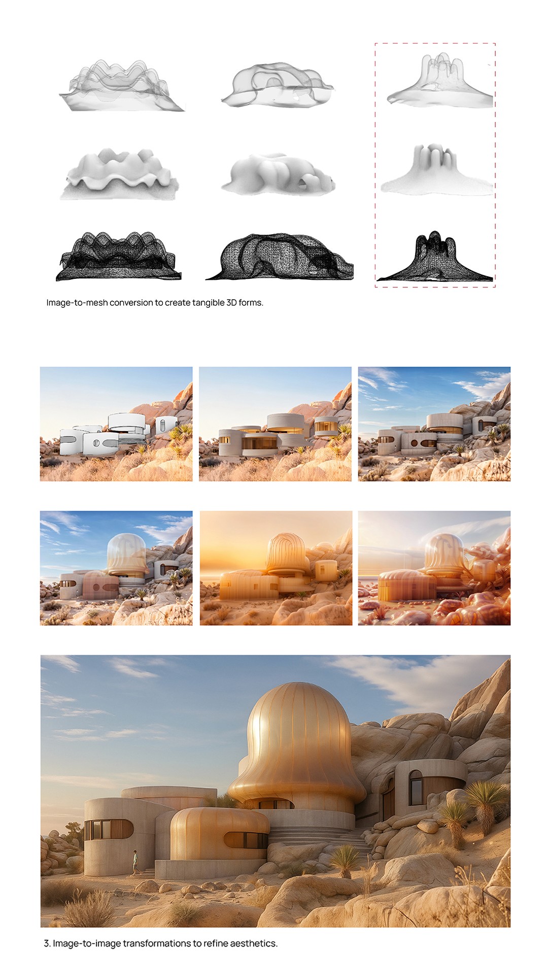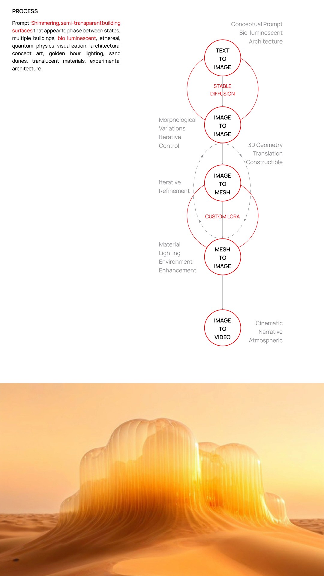 AI-Integrated Process: Developed concept through GenAI pipeline - text-to-image generation, image-to-image refinement, mesh conversion, and final narrative through image-to-video processing.