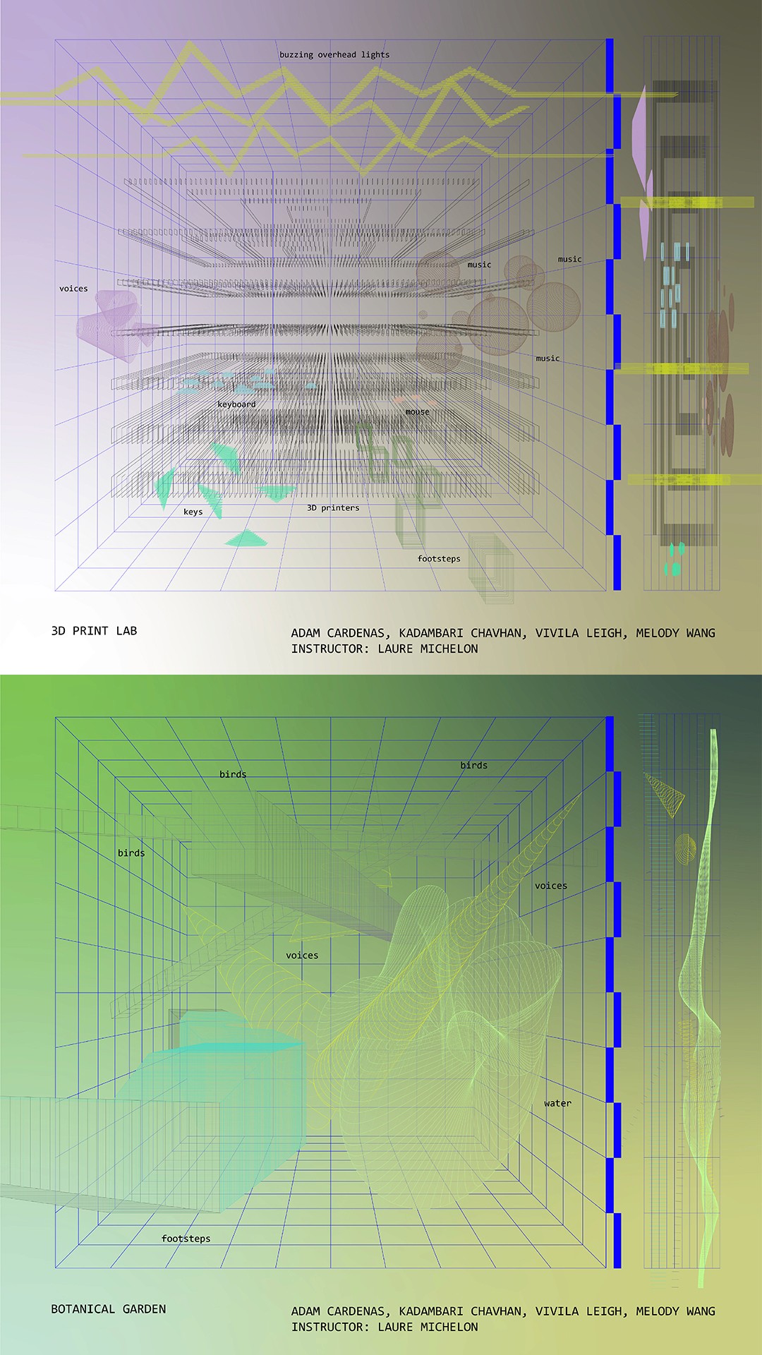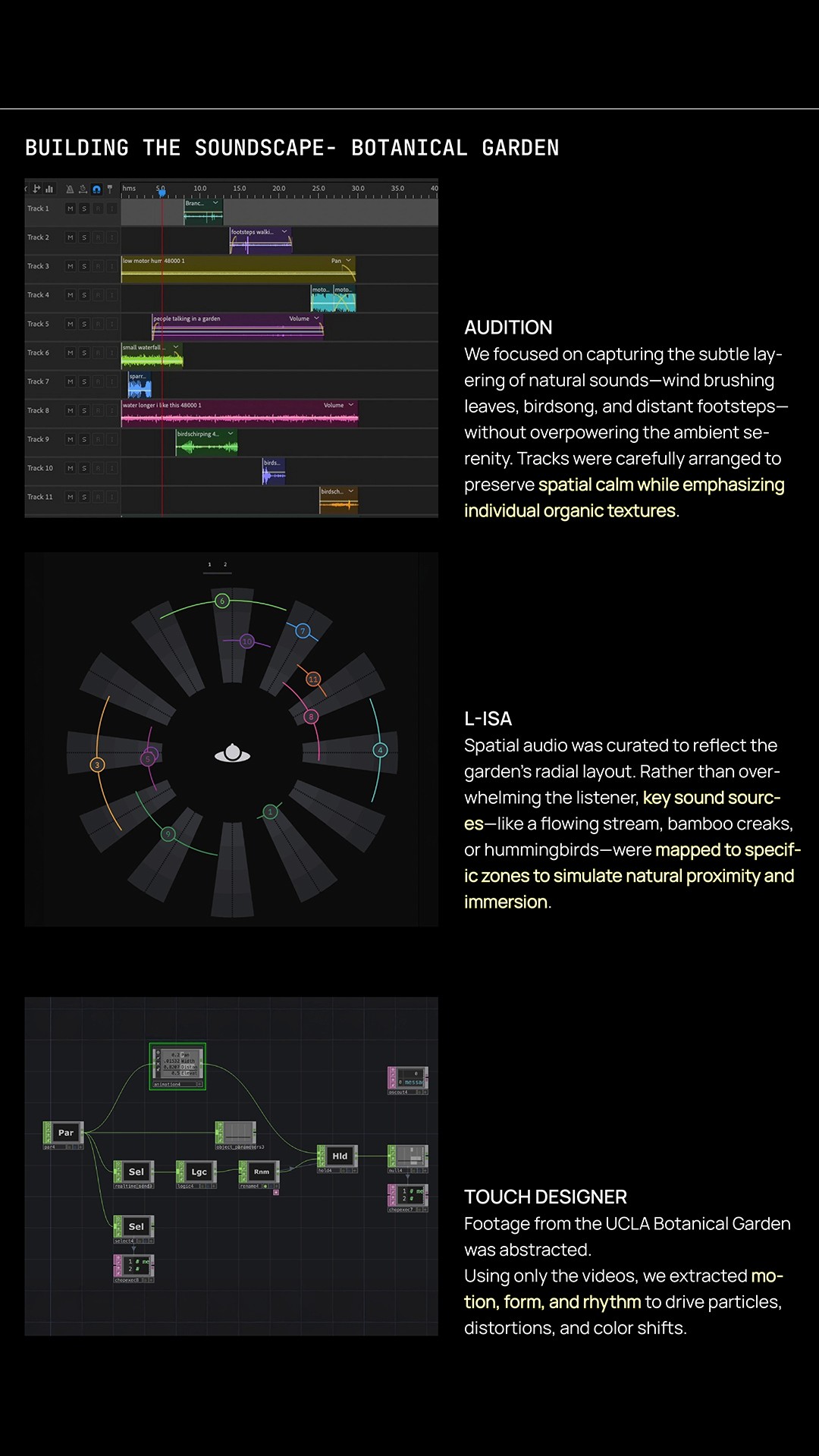 Spatial Audio Process: Observed contrasting environments - 3D print lab and botanical garden - then designed auditory experiences using L-ISA, Audition and Touch Designer to explore how sound alone shapes spatial perception and emotional response.