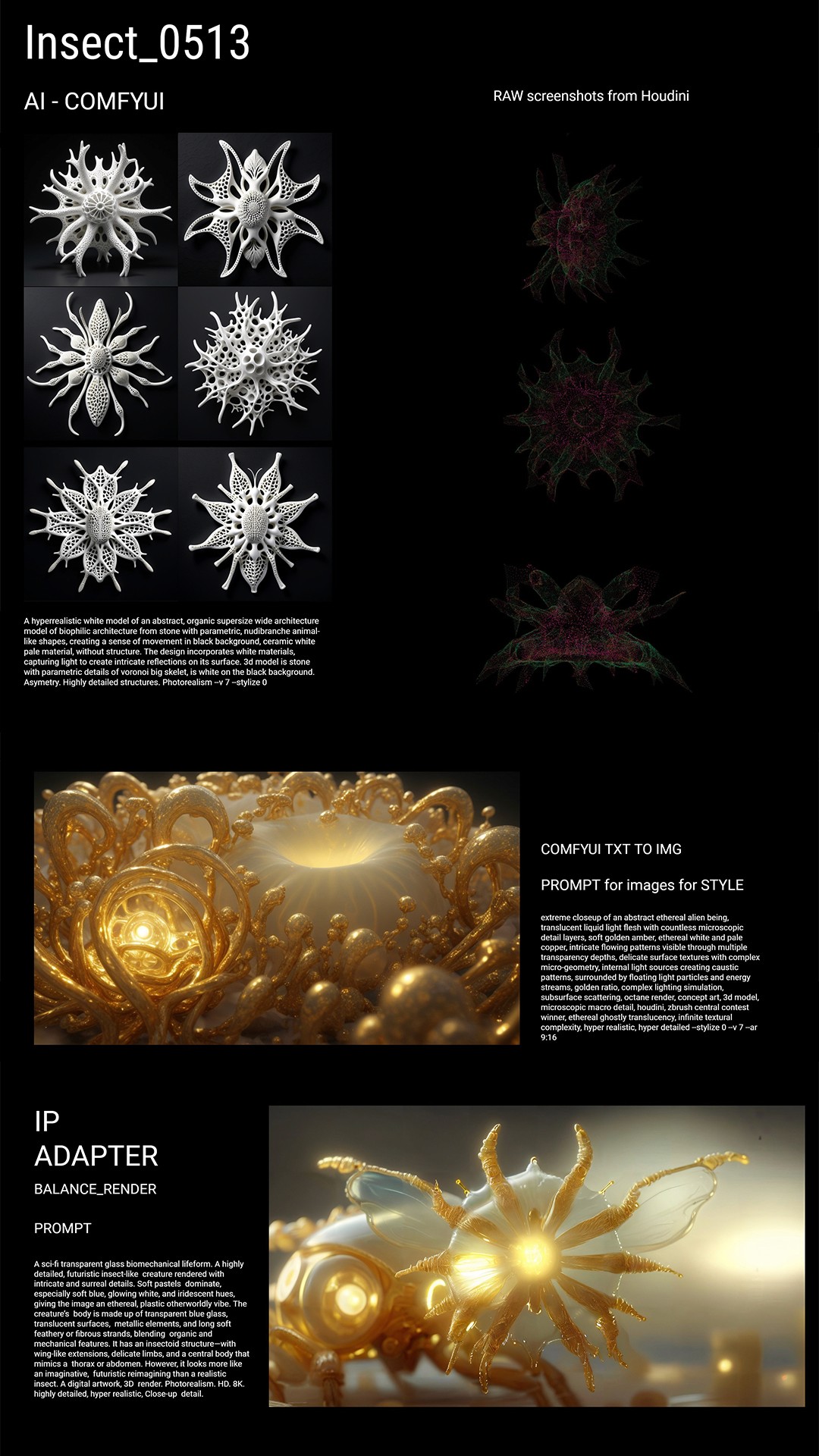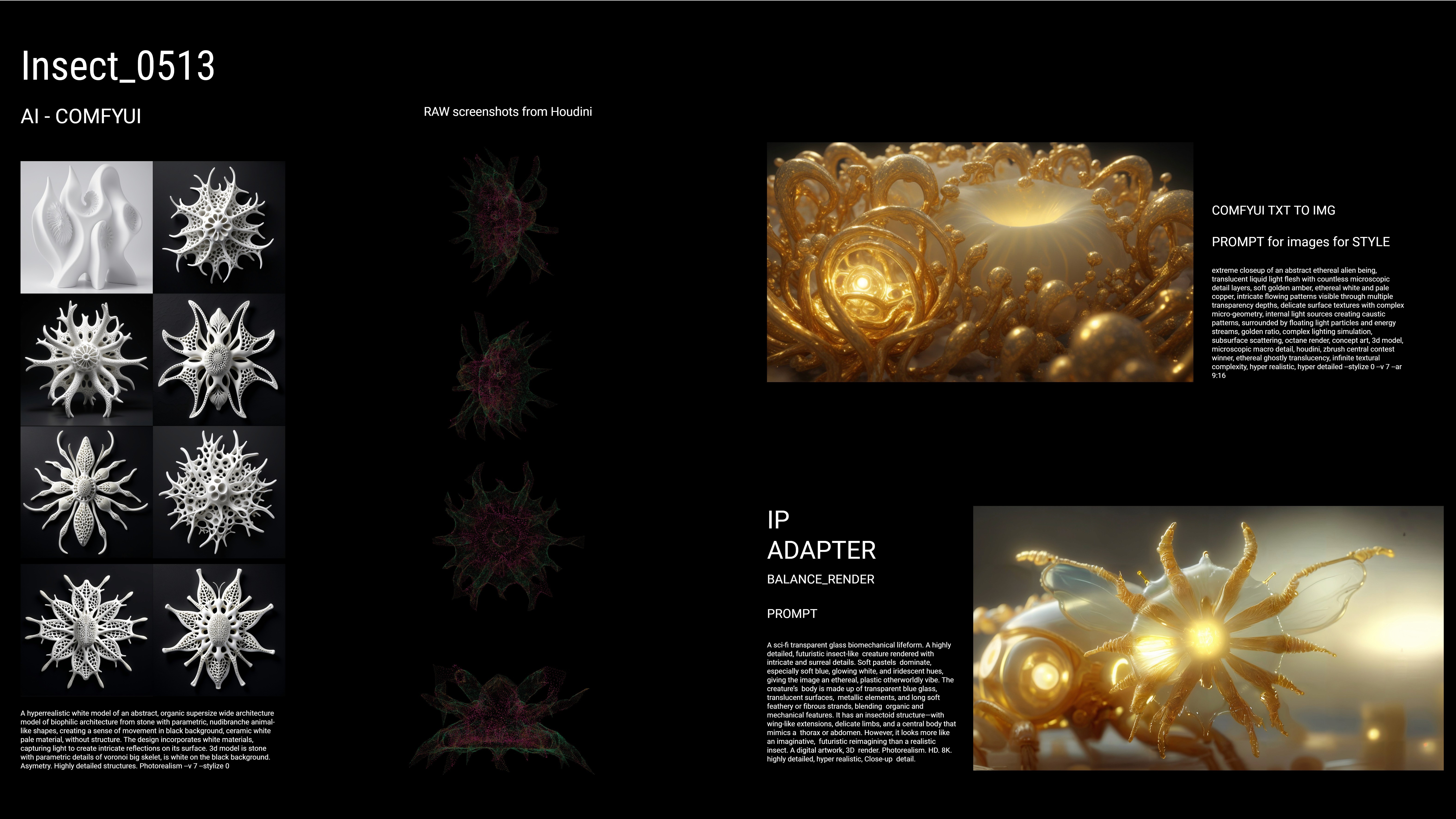 This project explores the frontier of GenAI design through algorithmic form-finding. Using Houdini for base geometry and ComfyUI's Stable Diffusion pipelines, organic structures emerge. The workflow combines parametric modeling with neural networks to create forms that balance computational logic with unexpected aesthetic qualities.
