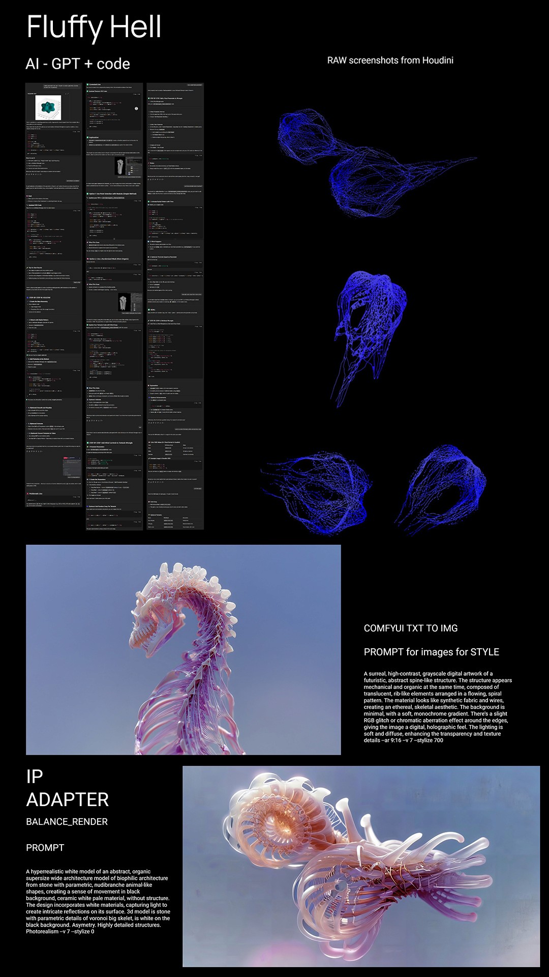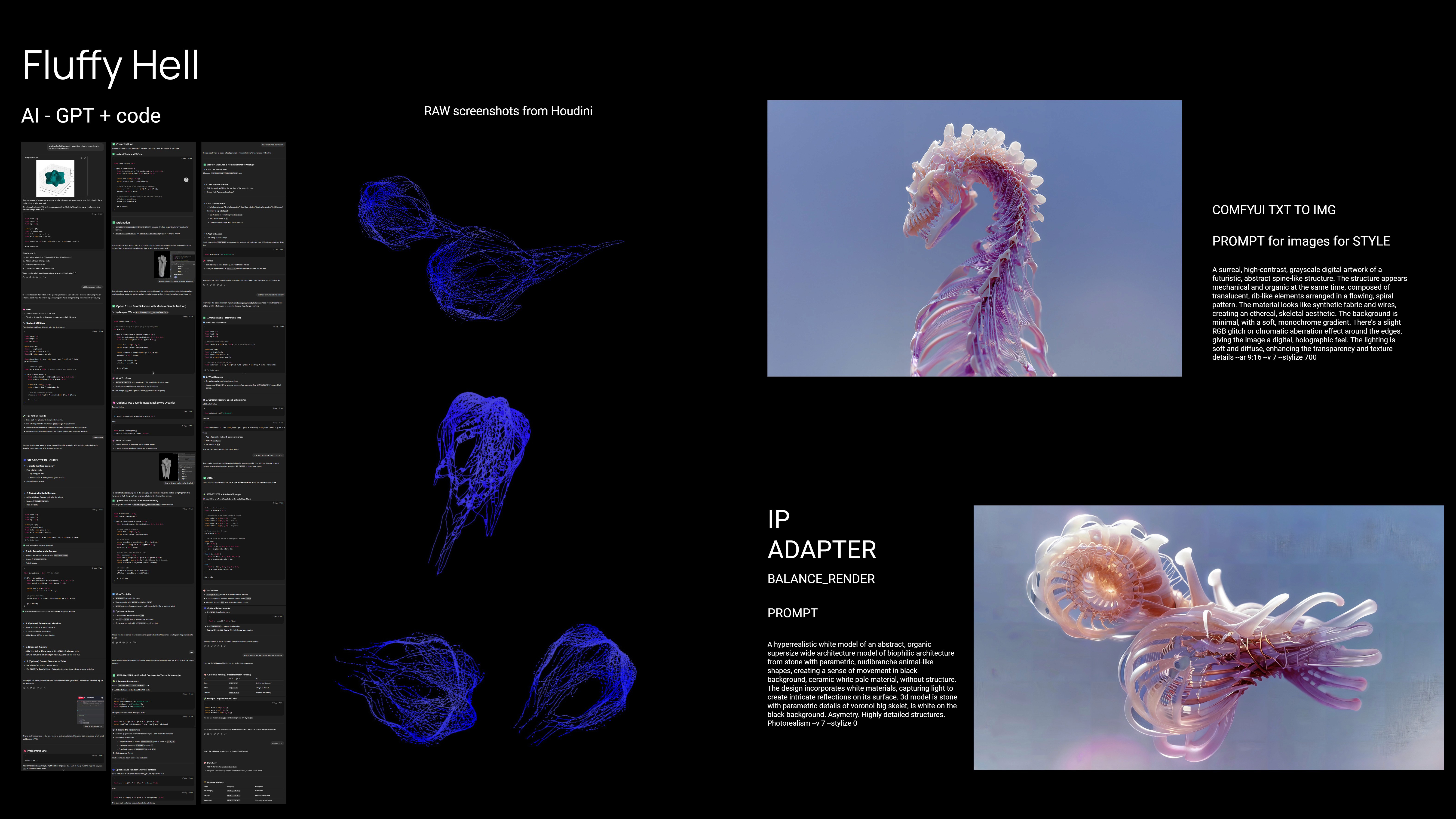 The workflow merges parametric modeling with AI generation: Houdini creates base topologies that are refined through Stable Diffusion pipelines. Text prompts guide form development while ControlNet maintains structural integrity, producing biomorphic architectures with coherent materiality.